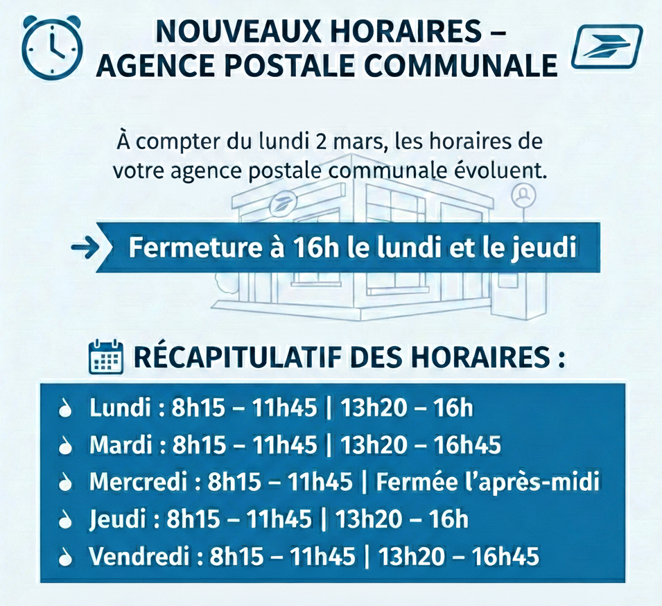 À compter du lundi 2 mars 2026, les horaires de votre agence postale communale évoluent.