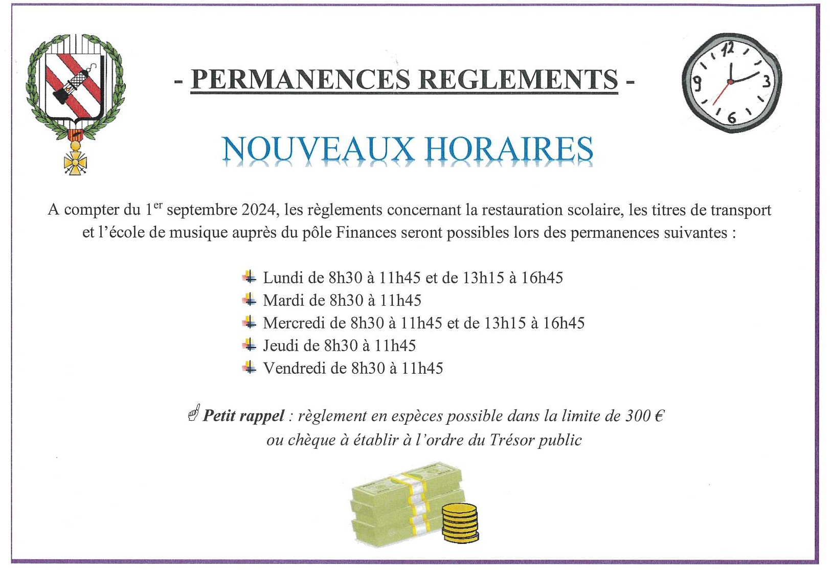 Nouveaux horaires concernant les règlements de la restauration scolaire, les titres de transport et l’école de musique auprès du pôle Finances.